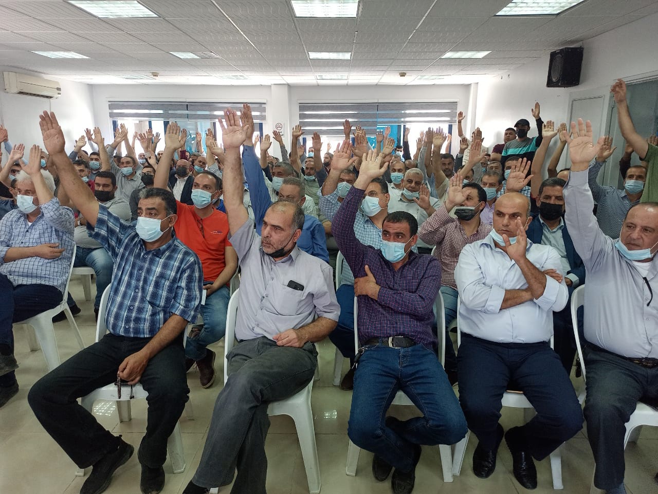 كما صوتت الهيئة العامة على قرارات العقوبات التي فرضها الاتحاد على شركتين خالفتا قرار الاتحاد بالمقاطعة الشاملة وفق اللوائح والقانون، مع تفويض مجلس ادارة الاتحاد بمواصلة قيادة هذه المعركة النقابية لاسترداد حقوق المقاولين في ضوء هروب حكومة اشتية للأمام ومحاولتها الفاشلة للقفز عن حقوق شركات المقاولات.