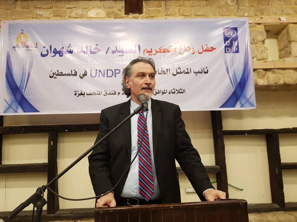 اقام اتحاد المقاولين الفلسطينيين حفل تكريم ووداع للمهندس خالد شهوان نائب الممثل الخاص لبرنامج UNDP وذلك بفندق المتحف بغزة بحضور رئيس وأعضاء مجلس إدارة اتحاد المقاولين واصحاب شركات المقاولات ومدراء الأقسام في برنامج UNDP.